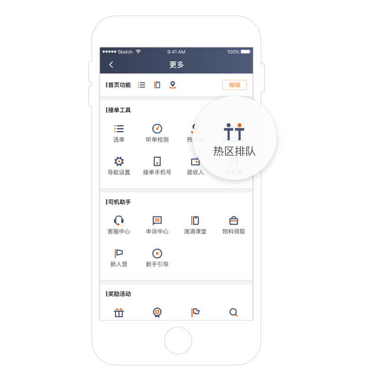 1. 常规入口位于司机端APP左上角“个人中心”-“查看全部功能”-“热区排队”: