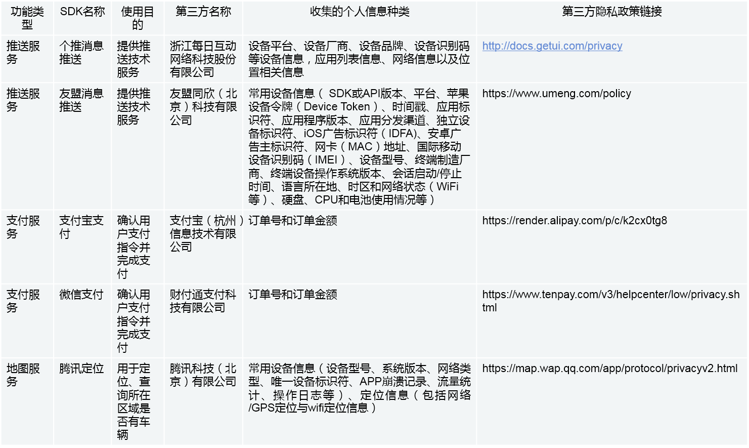 为保障青桔换电APP相关功能的实现与应用的稳定运行,我们可能会接入由第三方提供的软件开发包(SDK)以实现相关目的。不同版本的第三方SDK会有所不同,一般包括推送服务类、支付服务类、自助报警类等。您可以通过以下链接查看第三方的信息收集使用和保护规则。