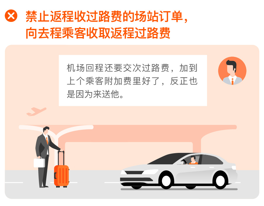 司机未按照平台规定,返程收过路费的场站订单,向去程乘客收取返程过路费,平台将扣除其服务分并扣取不当所得费用返还乘客。同时,情节轻微的,暂停服务1-3天;情节严重的,暂停服务15天;情节特别严重的,或金额巨大的,永久停止服务。