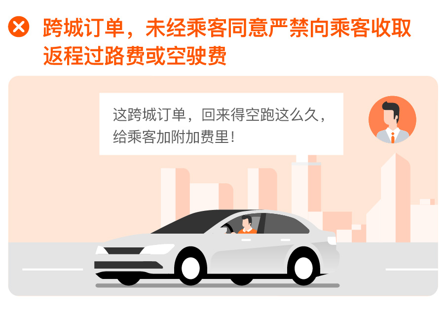 跨城订单,司机未经乘客同意,向乘客收取返程过路费或空驶费导致费用纠纷,平台将扣除其服务分并扣取不当所得费用返还乘客。同时,情节轻微的,暂停服务1-3天,情节严重的,暂停服务15天,情节特别严重的,或金额巨大的,永久停止服务。