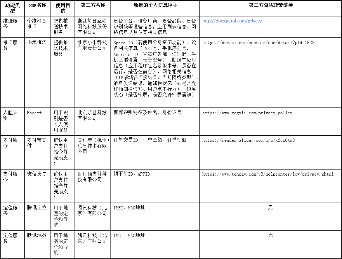 为保障滴滴企业版APP相关功能的实现与应用的稳定运行,我们可能会接入由第三方提供的软件开发包(SDK)以实现相关目的。不同版本的第三方SDK会有所不同,一般包括推送服务类、支付服务类、自助报警类等。您可以通过以下链接查看第三方的信息收集使用和保护规则。