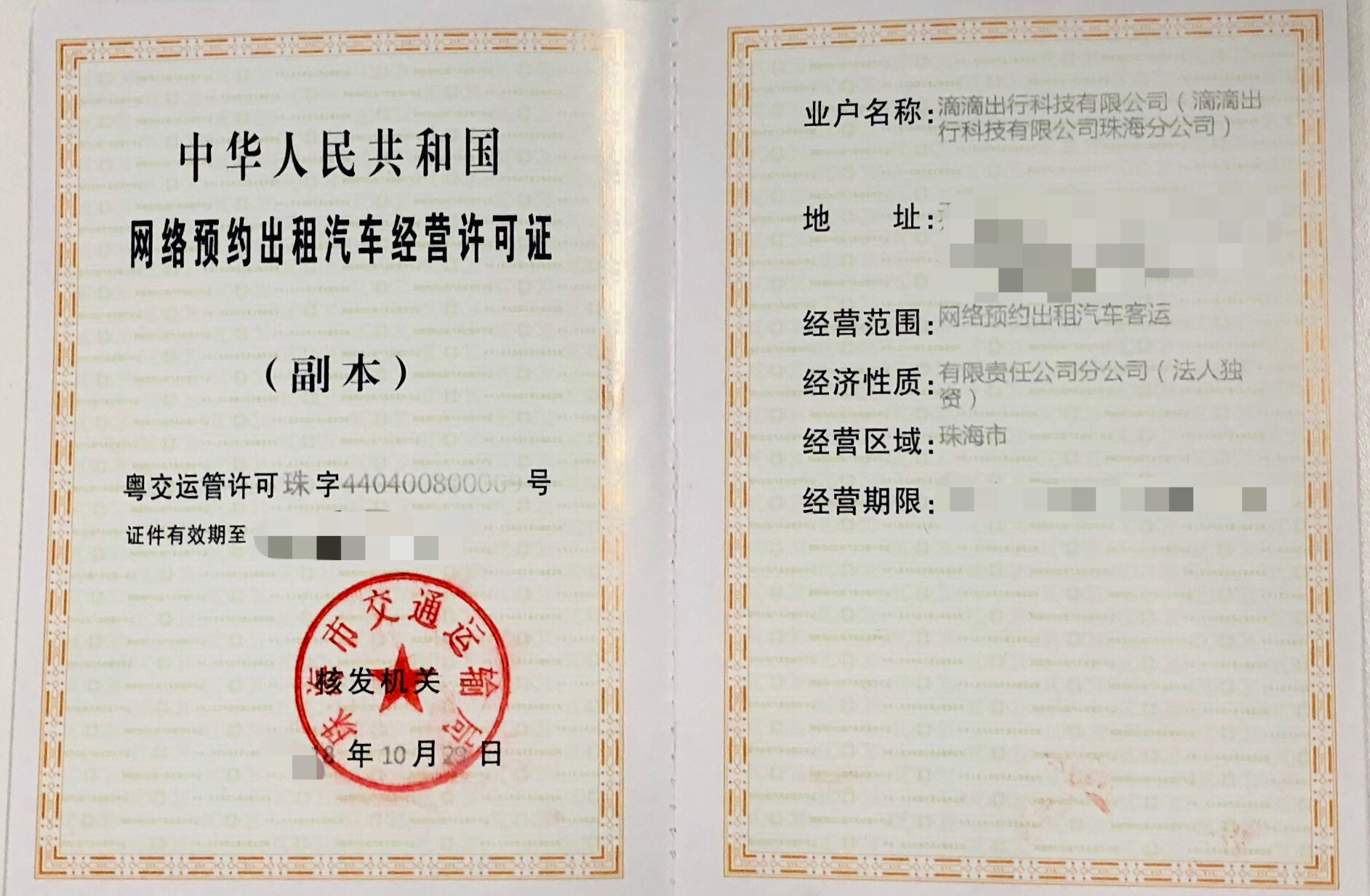 向滴滴珠海颁发《网络预约出租汽车经营许可证》