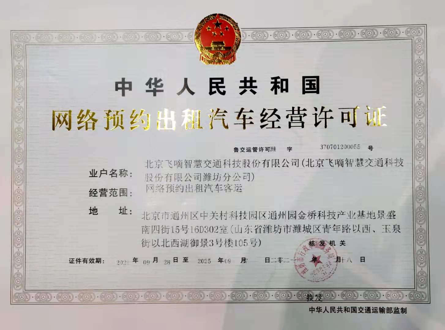 飞嘀打车 - 网约车经营许可证(潍坊)