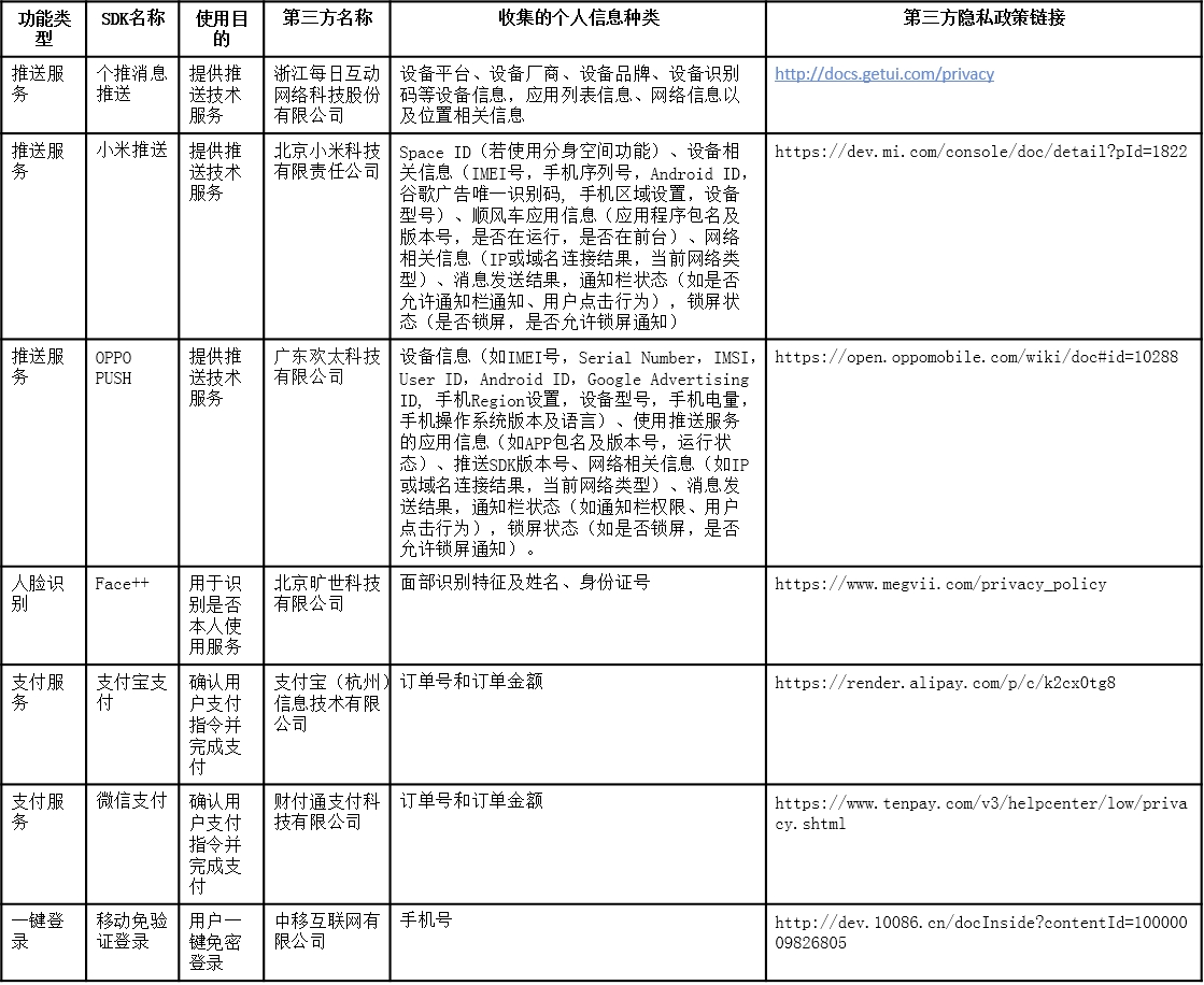 为保障小桔有车APP相关功能的实现与应用的稳定运行,我们可能会接入由第三方提供的软件开发包(SDK)以实现相关目的。不同版本的第三方SDK会有所不同,一般包括推送服务类、支付服务类、自助报警类等。您可以通过以下链接查看第三方的信息收集使用和保护规则。